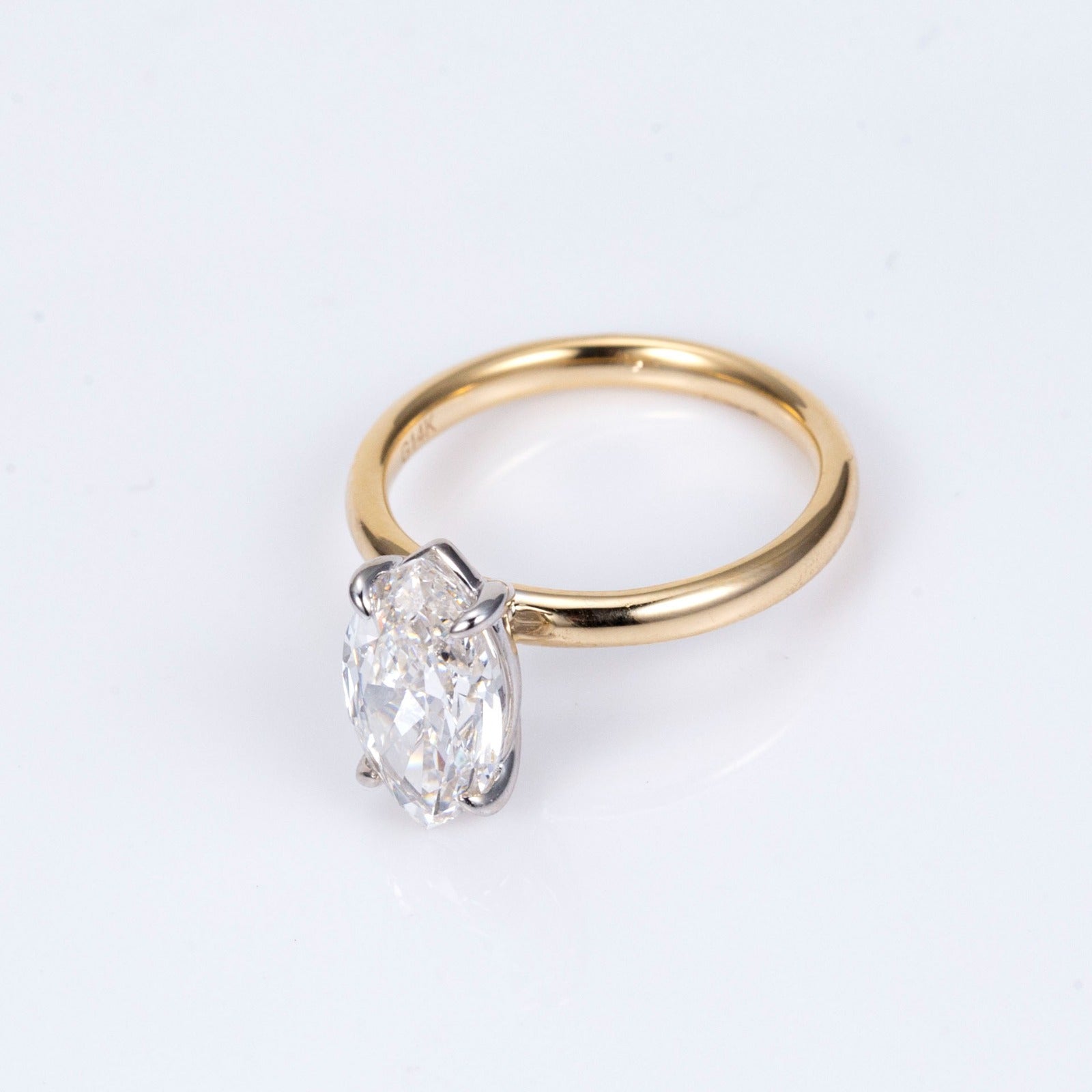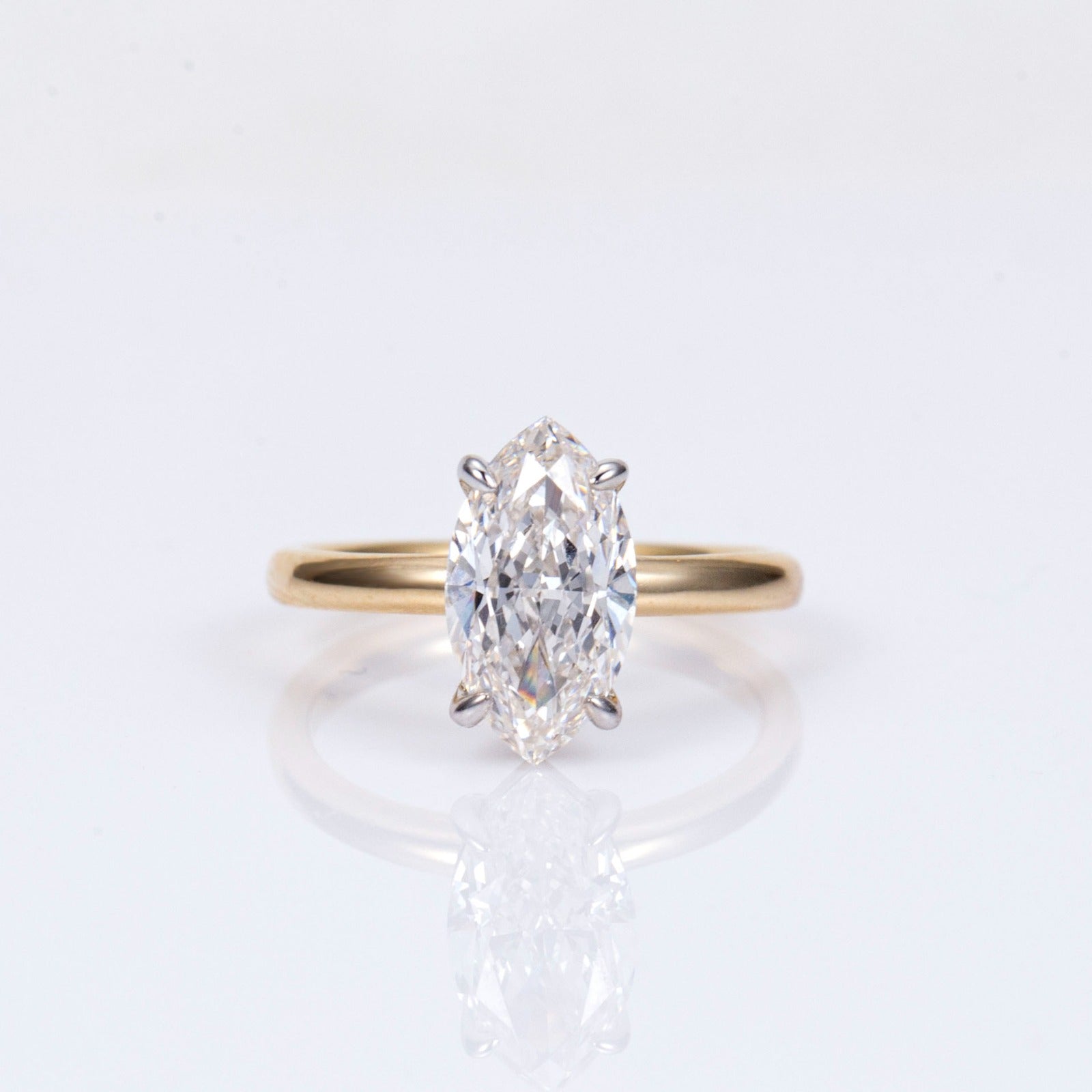 Set in 14K or 18K gold, this beautiful 2ct solitaire engagement ring showcases a striking Marquise cut centre stone held by four white gold eagle-tipped claws.